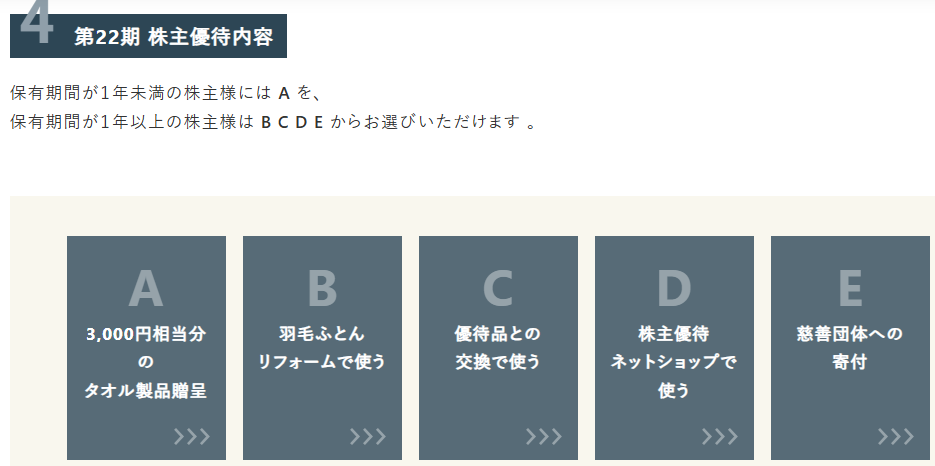 優待内容:保有期間が1年未満の場合A、1年以上の場合、BCDEから選択。