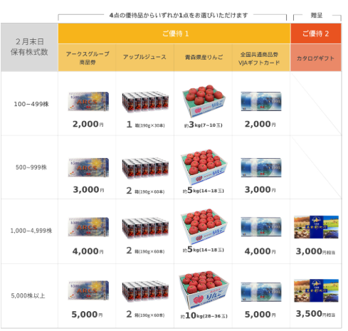 1,000株〜:ご優待1に加え、北海道グルメがつまった選べるカタログギフトを贈呈。