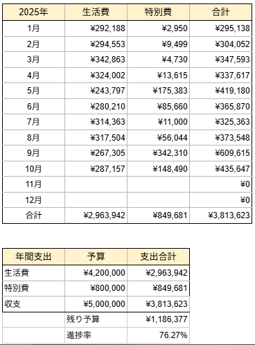 年間収支進捗状況とまとめ(2025年10月末時点)
